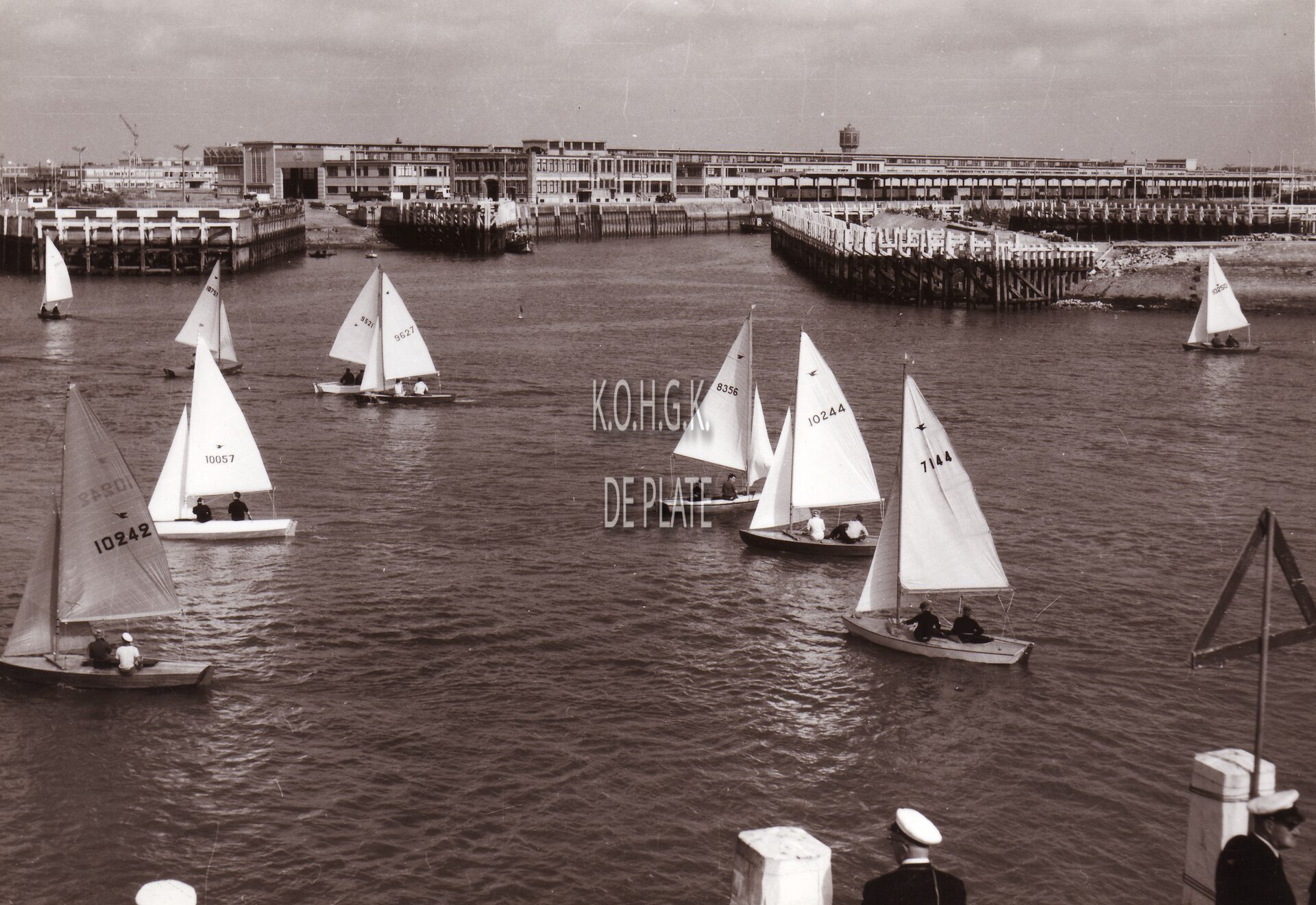 Formaat : 13 x 18 cm. - Deelnemers aan een zeilwedstrijd in de havengeul voor het clubgebouw van de N.S.Y.C. aan de Montgomerykaai.