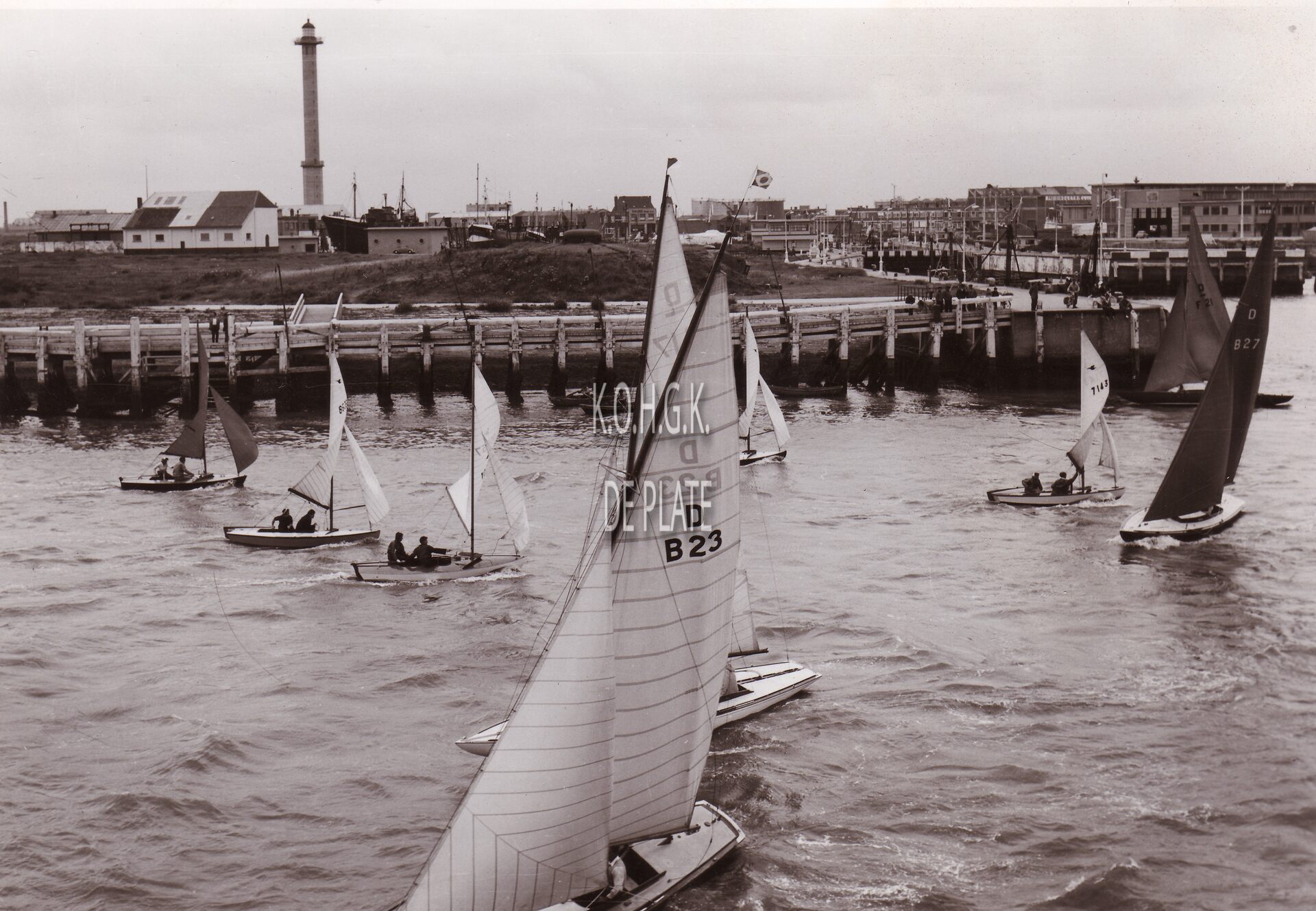 Formaat : 13 x 18 cm. - Deelnemers aan een zeilwedstrijd in de havengeul. Op de achtergrond de Oosteroever