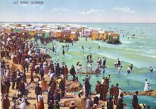 Adruk van postkaart, formaat : 14,5 x 28 cm. - Ostende - La plage Γ l'heure des bains. - Strandrecreatie op het Groot Strand.