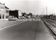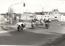 Formaat : 12 x 17 cm. - Enkele motorrijders op de Slijkensesteenweg richting centrum. In de achtergrond rechts de Bredenesesteenweg met de betonnen transformatorbunker . Links de brug richting Bredene