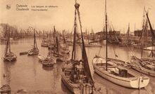 Het Zeestation. We zien nog de vernielingen aan de perrons tijdens de Eerste Wereldoorlog. Rechts, vissersvaartuigen in het eerste handelsdok. De brug over de zeesluis (links), die de handelsdokken verbindt met de havengeul.