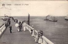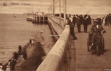 De pakketboot Jan Breydel verlaat de haven van Oostende. Veel volk op het einde van het Weststaketsel. Op 't koptje van 't hoofd"was er ook een paviljoentje waar het heerlijk toeven was en waar je kon genieten van de gezonde zeelucht. Op het einde, het ijzeren torentje met mistbel.