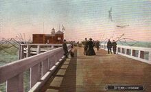 Veel volk op "koptje van 't hoofd". Links op het einde het wit ijzeren torentje met vast groen licht zichtbaar vanuit zee met mistbel (klok). Het café-paviljoen "Belveder". Rechts, richtingslicht bevestigd tegen de buitenleuning op galgpaal. Dient voor uitvarende schepen.