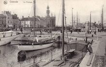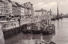 Vissersvaartuigen gemeerd in het Montgomerydok langs de Visserskaai. O.a. de O.57 Karel I en de O.230 Don Bosco. De werken voor de bouw van de Garnaalmijn zijn gestart.