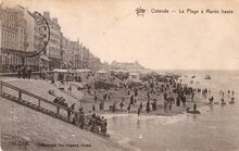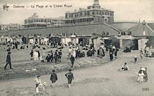 De Zeedijk gezien vanaf Petit Nice richting Koninklijk Chalet. Rechts, strandrecreatie op het Groot Strand. Vooraan, de talrijke strandtenten voor beschutting tegen wind en zon en langs de vloedlijn, de traditionele badkarren