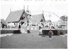 Formaat : 6 x 8 cm. - . De "Koninklijke Stallingen", ook "Noorse Stallingen" genaamd, gelegen in de Koninginnelaan 74-78. Ontwerp van de Noorse architect I.A. Knudsen van 1903, voltooid in 1904. Beschermd als monument bij KB van 22/09/1981