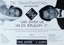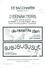 Regie: Jacky Tummers. Vlaams kreatie met Daniël Muyllaert en Herman Verschelden. Toneelvoorstelling onder de auspiciën van het departement van Nederlandse Cultuur.