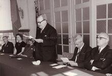 Burgemeester Adolf Van GlabbekeΒ bij de overhandiging in het dienstdoendΒ stadhuis (huidig gerechtshof) van hetΒ vaandel aan deΒ Oostendse folklore vereniging "De Oude Ijslandvaarders".Β Schepenen Jan PiersΒ en Kamiel DehouckΒ kijken toe.
