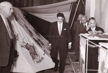 Een eerste steen wordt gelegd (onbekende locatie). Achter de betonbewapening links staat burgemeester Adolf VAN GLABBEKE met naast hem minister Omer VAN AUDENHOVE van Openbare Werken.