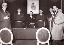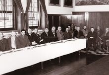 De gekende franseΒ oceanograaf Alain Bombard wordt ontvangen op het Oostends stadhuis (het huidige gerechtshof). Achter de tafel van links naar rechts schepen Maurice Quaghebeur sr.,Β burgemeester Adolf Van Glabbeke,Β schepen Kamiel Dehouck en stadssecretaris Michel Surmont. RechtsΒ Alain Bombard. Hij gaf ook een lezing in de Koninklijke Schouwburg en werd na zijn ontvangst op het stadhuis ook begroet in de Rotary Club.
