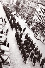 Onder het oog van burgemeester Adolf VAN GLABBEKE plaatsen minister van openbare werken OmerΒ VAN AUDENHOVE en een onbekende deΒ eerste steen van de Grote Post. Achter de minister Pierre VAN OUTRYVE D'YDEWALLE (gouverneur van West-Vlaanderen)
