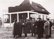 De broers VAN COILLIE van de gelijknamige aannemersfirma verwelkomen Monseigneur De Smet, bisschop van Brugge, op de werf van de nieuwe O.LV. Koninginnekerk van Mariakerke.