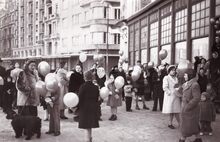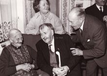 Een eeuweling met naast hem zijn vrouw (?) wordt gelukgewenst door Hector Muylaert (rechts). Muylaert was uitbater van de verf- en onderhoudsproduktenwinkel Franco Belge op de Groentemarkt 10, naast de danszaal Valentino