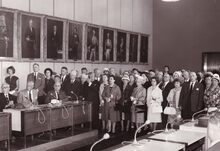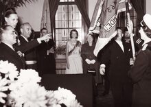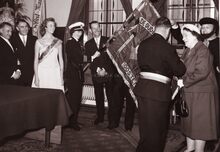 Plechtigheid op het dienstdoend stadhuis (gerechtshof). Burgemeester Adolf Van Glabbeke ontvangt de folkloregroep "De Oude Ijslandvaarders" voor de overhandiging van hun vlag. Ook de schoonheidskonigin 1958, mejuffrouw Yvette Fretin van hun vereniging is aanwezig