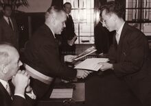 Bezoek van de Mwami van Rwanda. Onder het goedkeurend oog van schepen Jan Piers tekent de echtgenote van de Mwami het gulden boek. Achter schepen Jan Piers, schepen Kamiel Dehouck.