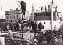 Formaat : 13 x 18 cm. - De "Polarhav" ligt aangemeerd in de haven bij de Havenkapiteinsdienst. Met dit schip nam België deel aan de expedities naar de Zuidpool. Er is duidelijk massale belangstelling. Links met zwarte pet, de leden van de expeditie.