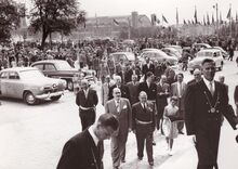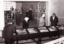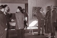 Burgemeester Adolf VAN GLABBEKE opent een tentoonstelling in de Koninklijke Gaanderijen, zijn echtgenote (in het wit en met bloemen) was er ook bij evenals een Japanse afvaardiging. Achter mevrouw VAN GLABBEKE, een jonge Fred RIGAUX, hoofd toerismedienst.