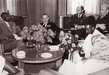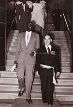Burgemeester Adolf Van Glabbeke ontvangt de Mwami van Rwanda en echtgenote. Rechts, schepen Kamiel Dehouck
