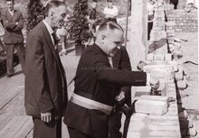 Burgemeester Adolf Van Glabbeke metst de eerste steen van het stedelijk speelplein Duin en Zee. Geopend op 30 juni 1958