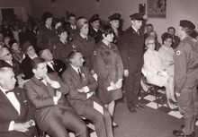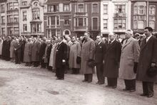 Hulde door notabelen en oudstrijders aan het Monument voor de gesneuvelden van het 3de en 23ste Linieregiment aan de Graaf de Smet de Naeyerlaan. Van rechts naar links vooraan : schepenen Roger De Kinder en Emiel Vroome, burgemeester Henri Serruys, Adolf Van Glabbeke. Centraal een deurwachter.