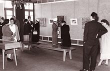 Opening tentoonstelling van "Het Salon van de Oostendse Kunstkring" in de Koninklijke Gaanderijen. Centraal in het wit mevrouw Adolf VAN GLABBEKE (mevrouw MULLIE). Naast haar links, schepen Frans VAN CAILLIE, en rechts, kunstschilder Jan DE CLERCK, met baard. Er was ook een japanse afvaardiging. Derde vanaf rechts, met vlinderdas, kunstschilder Albert HAGERS. Op het bord achter hen "Salon der stichters, Salon des fondateurs en het wapenschild van de stad Oostende 1907-1957".