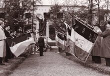 Diverse oudstrijdersverenigingen bij een hulde aan het Monument, gelegen aan de Graaf de Smet de Naeyerlaan. Op de achtergrond de ontmijningsschool.
