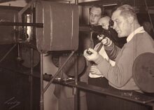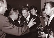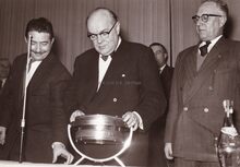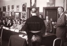 Burgemeester Adolf VAN GLABBEKE bij een prijsuitreiking in het dd.stadhuis (huidig gerechtshof),naast hem zit schepen Kamiel DEHOUCK.