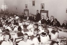 Een banket in het restaurant van het Hotel Wellington op de Albert I-promenade. Tweede van links vooraan Alfred Rigaux, hoofd dienst toerisme.