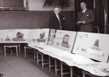Formaat : 13 x 18 cm. - Kunstenaar Emile Bulcke en schepen Maurice Quaghebeur sr. op de tentoonstelling in het Gerechtshof met de presentatie van de ontwerpen voor de praalwagens voor de praalstoet n.a.v. de opening van het nieuwe Casino-Kursaal. De ontwerpen voor de praalwagens zijn van Emile Bulcke met medewerking van Marc Plettinck, Raoul Servais en Vieren.