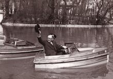 Formaat : 13 x 18 cm. - Burgemeester Henri Serruys test een electrisch bootje op de vijver van het Leopoldpark.