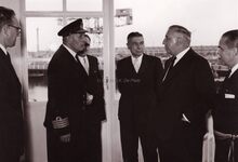 Minister van verkeerswezen Paul Willem SEGERS bezoekt de haveninstellingen van Oostende. Uiterst rechts burgemeester Adolf VAN GLABBEKE.