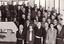 Een voetbalclub (VeeGee ?) werd ontvangen op het stadhuis en poseert achteraf op de trap .Centraal vooraan Jan PIERS,burgemeester,links Kamiel DEHOUCK en rechts Jozef VAN DEN KIEBOOM schepenen,naast deze laatste Wilfried PUIS,internationaal voetballer.achter PUIS,Albert DEVYNCK,hoofd dienst Financien en Raymond VANDENBERGHE,later hoofd personeelsdienst stad Oostende.