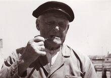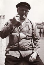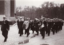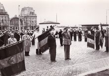 Michel Decoster ,voorzitter, met diverse oudstrijdersverenigingen bij een vaderlandse plechtigheid aan het monument der gesneuvelden op het Sint Petrus en Paulusplein.Op de achtergrond het Zeestation. Het witte diensthuisje van de sluiswachter, was o.a. een openbaar W.C., dat niet al te fris rook en er voor staat een frietkot ! Rechts, het tramwachthuisje
