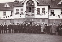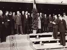 Een dame verwelkomt de genodigden op de renbaan. Centraal Marcel Friederichs,gemeenteraadslid en naast de dame in het wit staat, schepen Louis Vanhoorne