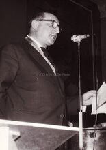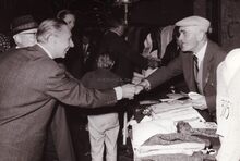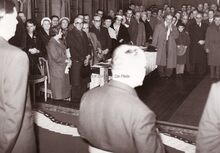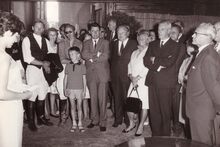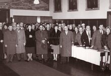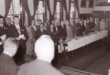 Burgemeester Adolf Van Glabbeke bij de overhandiging in het dienstdoend stadhuis (huidig gerechtshof) van het vaandel aan de Oostendse folklore vereniging "De Oude Ijslandvaarders". Schepenen Jan Piers en Kamiel Dehouck kijken toe.