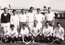 Eclair Hockey Club op het plein achter de Koninklijke Gaanderijen waar thans het stedelijk zwembad staat.op de achtergrond de Koninginnelaan en de Drie Gapers. Staande tweede van links Eric VAN OYE,vijfde .......... BEUSELINCK.