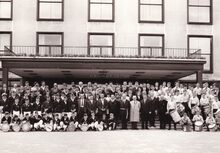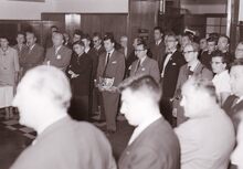 Formaat : 13 x 18 cm. - Personeelsfeest van de firma "Fichefet" in het lokaal "Prins Boudewijn", Sint-Sebastiaanstraat 22. Vereremerkte werknemers en hun familie. Paul Fichefet, links naast mevrouw, ontving uit de handen van minister Adolf Van Glabbeke, de gouden medaille van de Orde van Leopold II. Kregen het Nijverheidsereteken : Jules Fichefet, Joseph Soenens en W. Van de Casteele. Kreeg het nijvereheidsereteken tweede klasse : Prosper Versieck. - Bron : Het Kustblad, 05/05/1954,p.2,foto.