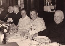 Een witte pater (missionnaris) MARCUS, met zijn moeder, woonachtig in de Koninginnelaan, en naast haar pastoor Joseph DE VISCHERE, van Sint-Jozef en E.H. Albert SMEETS, godsdienstleraar aan het Koninklijk Atheneum wordt gevierd op een banket, rechts van hem deken BUTAYE .