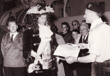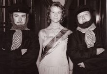 Twee leden van de folkloregroep "De Oude Ijslandvaarders", met hun schoonheidskoningin 1958, Yvette Fretin in hun midden. Foto van de plechtige ontvangst in het dienstdoend stadhuis (Gerechtshof), naar aanleiding van de overhandiging van hun vlag door burgemeester Adolf Van Glabbeke
