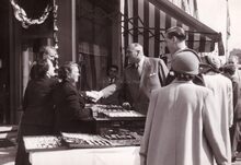 Adhemar GERARD, apotheker van "de Olifant" op de braderie. Achter hem Jan PIERS en John LAUWEREINS. Blijkbaar is de standhouder een oudstrijder blijkens de talrijke eretekens op zijn kraag.