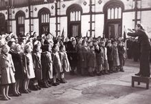 Florimond Corsellis repeteert in de Alberthall van het voormalig spoorwegstation aan het Ernsest Feysplein met de kinderen van de stedelijk onderwijs voor het jaarlijks openluchtfeest in de velodroom