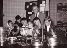 Zwart/wit foto Antony nr. 300655-20. Formaat : 13 x 18 cm. – Binnenzicht van de leeszaal in de Stadsbibliotheek in Chez Pan, hoek Van Iseghemlaan en Vlaanderenstraat.