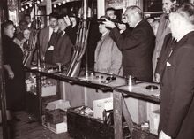 Oostendse schepenen in het schietkot op de Oktoberfoor. Rechts, de schepenen Jan Piers, Kamiel Dehouck, met geweer, en naast hem burgemeester Adolf Van Glabbeke