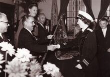 Links Paul DEPAEPE die een of andere oorkonde krijgt aan boord van de Kamina (Zeemachtschip).