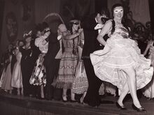 Lentefeest in het Kursaal,de kinderen worden begeleid door notabelen. Vooraan schepen Alfons LARIDON, rechts achteraan schepen Raymond MIROIR. De kaalhoofdige man is Jan DUFOUR, uiterst links Roland BENS, achteraan ook Edgard MASSCHALCK , gemeenteraadslid en hoofdinspecteur lager onderwijs