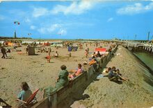 Photo-Hall. - Strandrecreatie op het Klein Strand. Links in de achtergrond, het Monument der Zeelieden. Rechts het Weststaketsel
