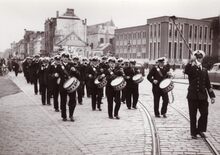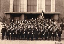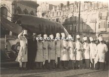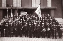 De stadsharmonie op de trappen van het dienstdoend stadhuis (huidig gerechtshof), na een plechtige ontvangst. De man in het midden met boekje in zijn hand is Charles Deturck, de dirigent van de stadsharmonie van 1921 tot 1954. Er was ook een afvaardiging van "Het Looze Visschertje", met hun vaandel van de partij.