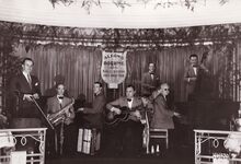 Het dansorkest Alfons BOEHME in dancing "Chez Pan", dat zich bevond hoek Vlaanderenstraat - Van Iseghemlaan, in het complex van de Koninklijke Schouwburg. Links, Alfons Boehme, naast hem Gust Vanhoutte, (tenorsax, klarinet en accordeon) en aan de piano, met bril, Willy Albimoor