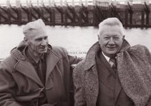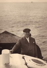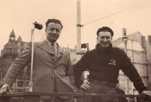 Schepen Emiel Vroome met een onbekende vriend (?) op een boot in de havengeul van Oostende