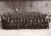 De brigade van de Oostendse rijkswacht poseert mét vaandel op de koer van hun kazerne aan de Alfons Pieterslaan.